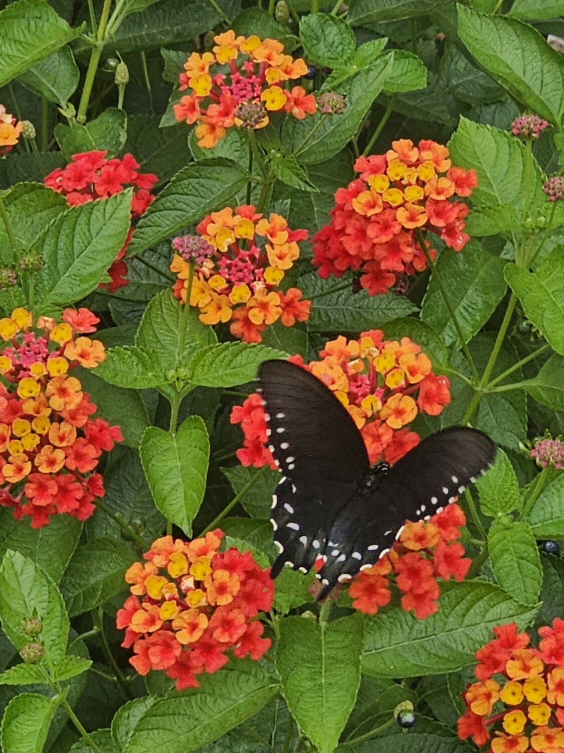 Black and blue butterfly on orange and yellow flowers