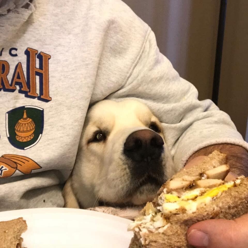 Our sweet Zeke admiring my sandwich