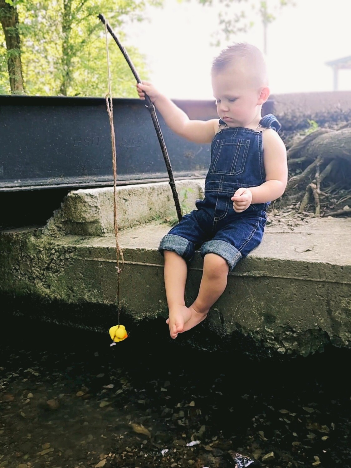 This is a picture of my son, Colt River fake fishing with a rubber duck